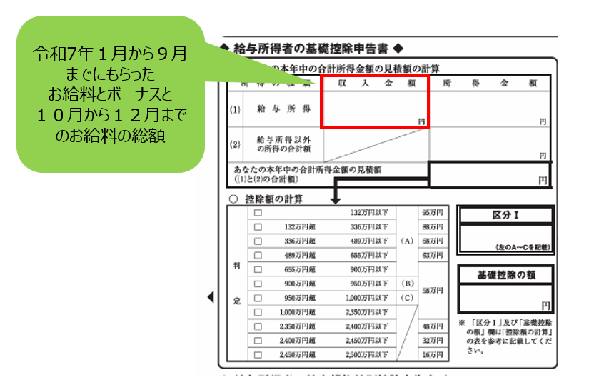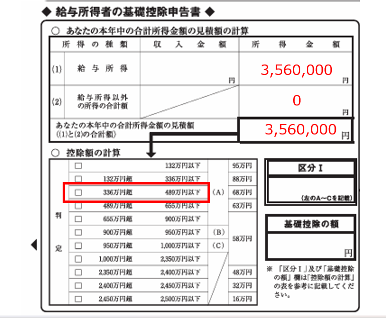 所得金額の右側に(A)(B)(C)とあるので、該当するものを区分Ⅰに記入し、基礎控除の額を書きます。