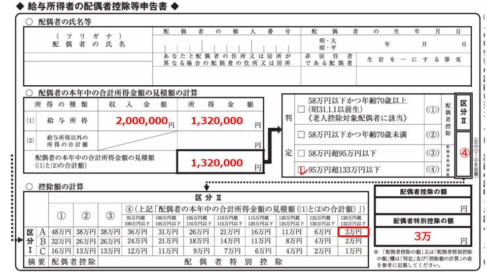 給与所得者の行の収入に200万円を、所得のところに132万円を記入します。