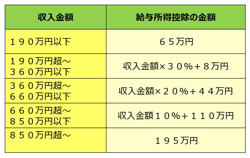 | 年収 | 計算式 | 給与所得控除額 | 所得金額(年収-控除) |